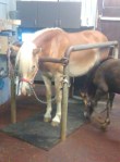 Während Mama so friedlich schwankend die Prozedur über sich ergehen ließ, war Baby etwas irritiert, bzw. stink sauer, dass es wieder nicht auf die Weide gegangen ist. Trotzdem ließ sie die Tierarzthelferinnen in Ruhe ihre Arbeit machen und blieb auch sonst im Hintergrund.